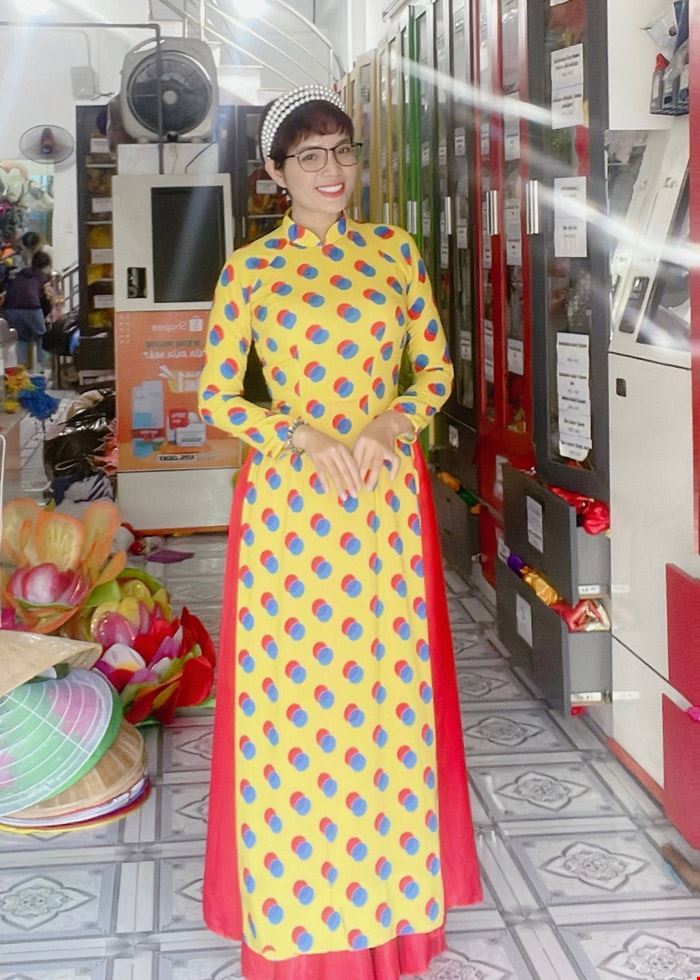 Áo dài cô 3 Sài Gòn vàng chấm bi đỏ xanh