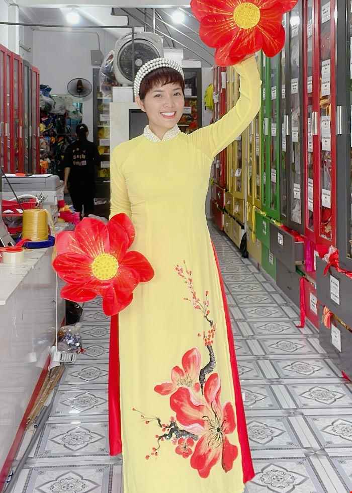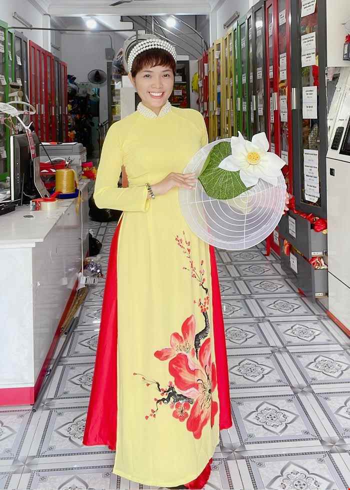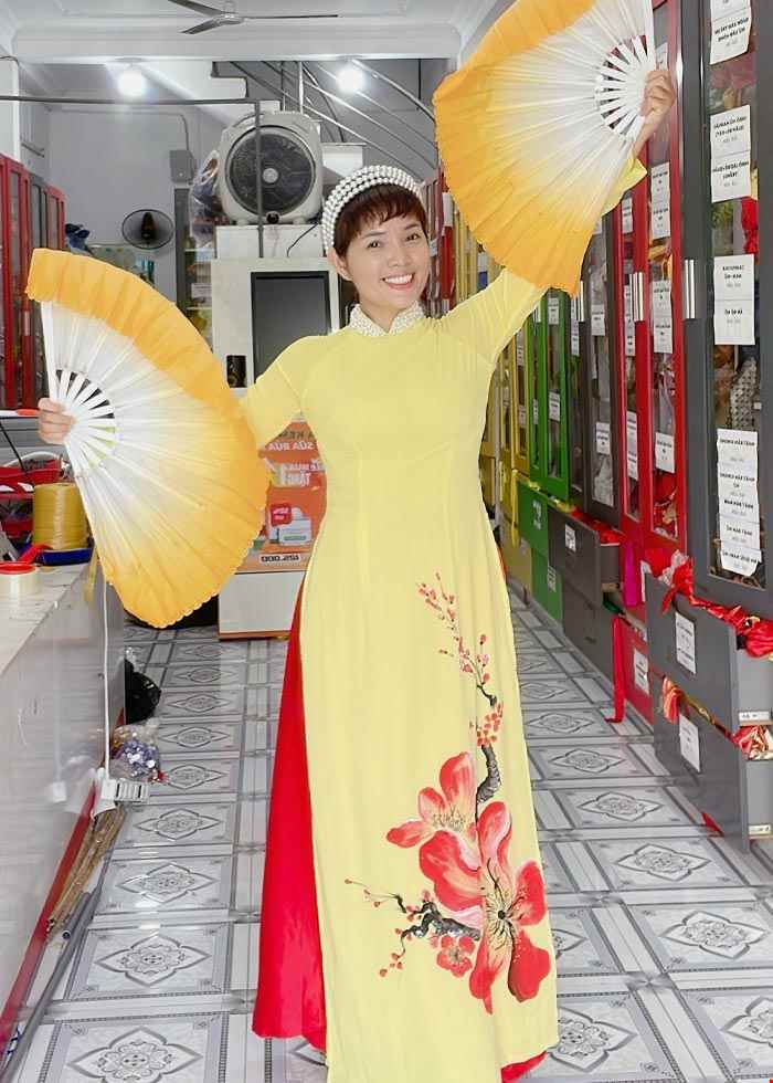 Aó dài hát múa màu vàng, vẽ hoa
