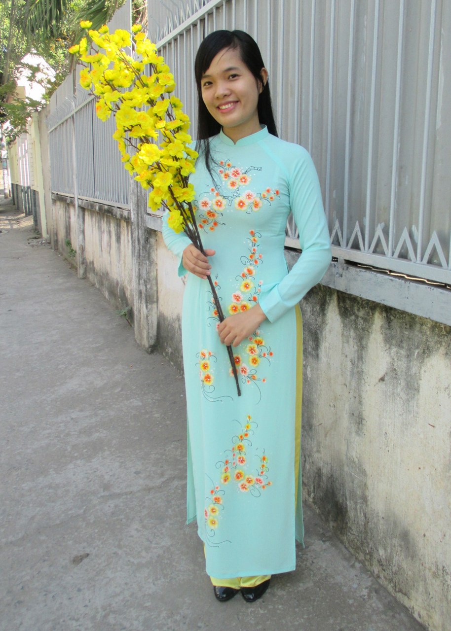 Áo dài lụa xanh ngọc vẽ mai đào