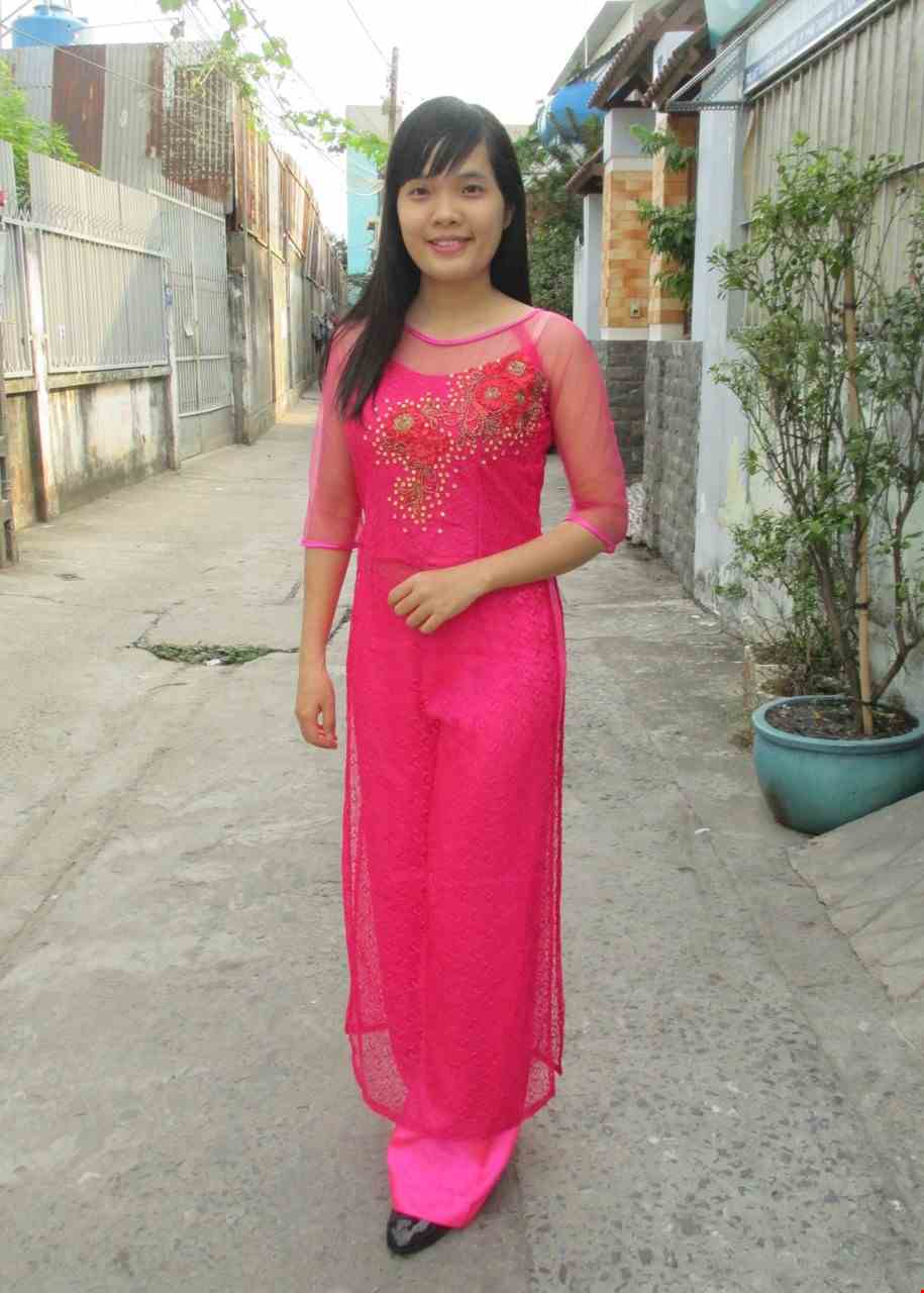 Áo dài lưới hồng tay lỡ kết đá, hoa đỏ