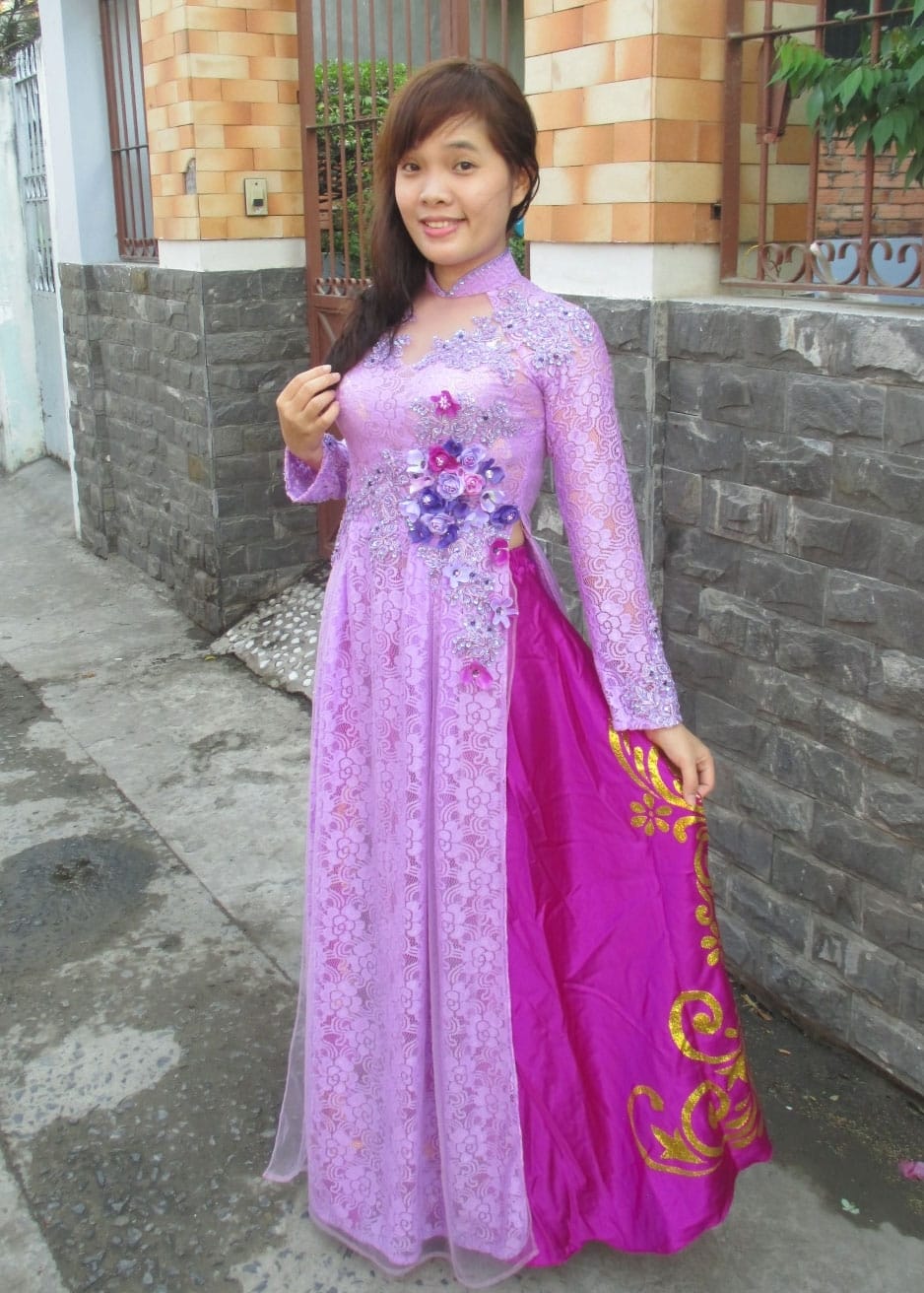 Áo dài lưới lót ren tím kết hoa đá