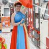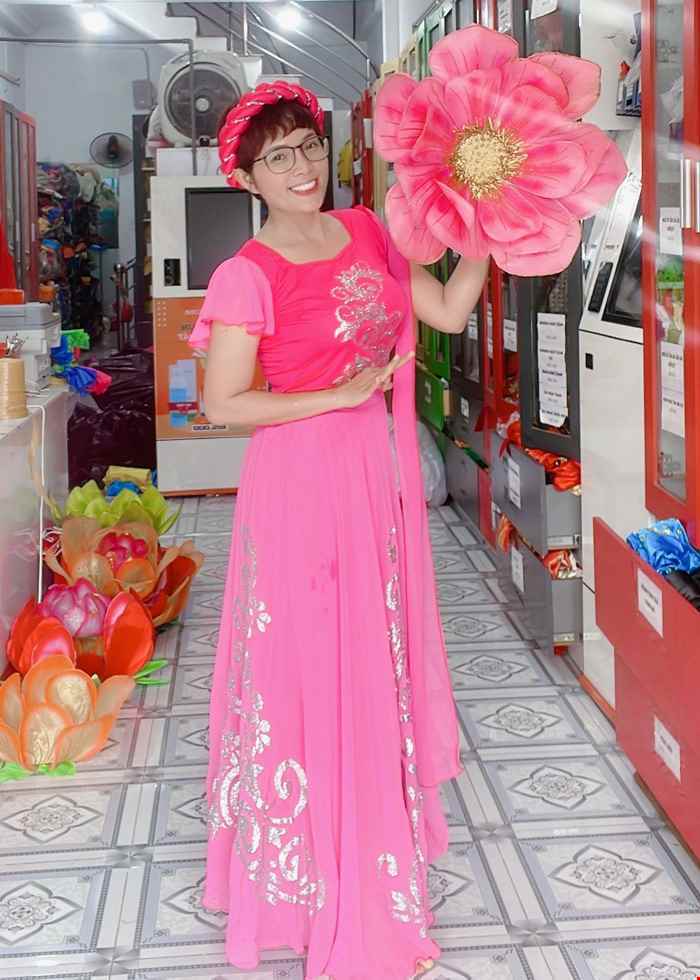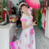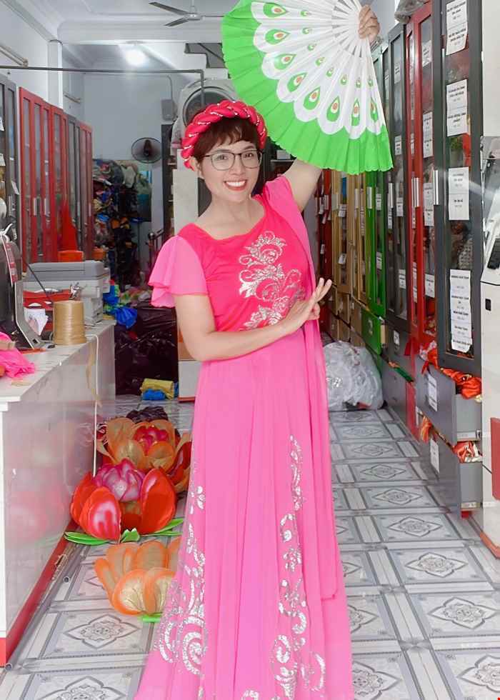 Áo váy múa hát đương đại màu hồng ngọt ngào, tay cánh tiên phối dây lụa