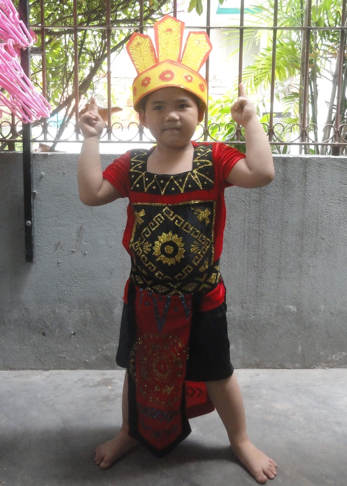 Gồm áo yếm, quần, đai nhiều tà và nón.