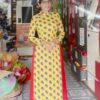 Áo dài múa quê hương đất nước, mừng Đảng, mừng Xuân. Áo dài ren đỏ kết hoa vàng.
