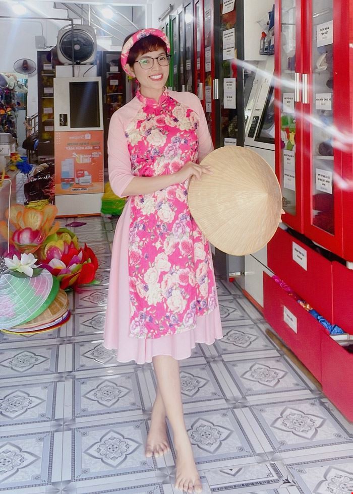 Bộ áo dài cách tân gấm hoa hồng tay voan lở