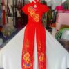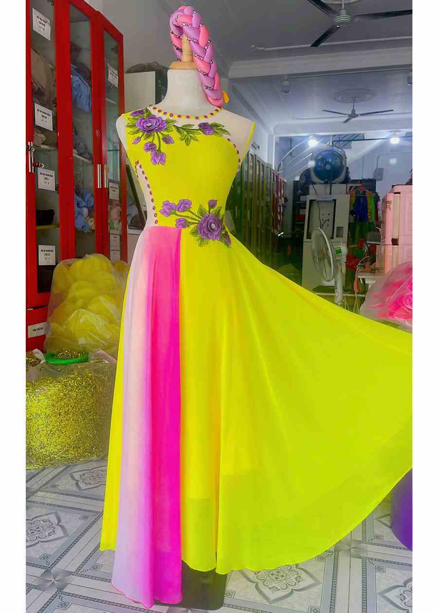 Đầm ca hát múa vàng, tà hồng, hoa 3D tím