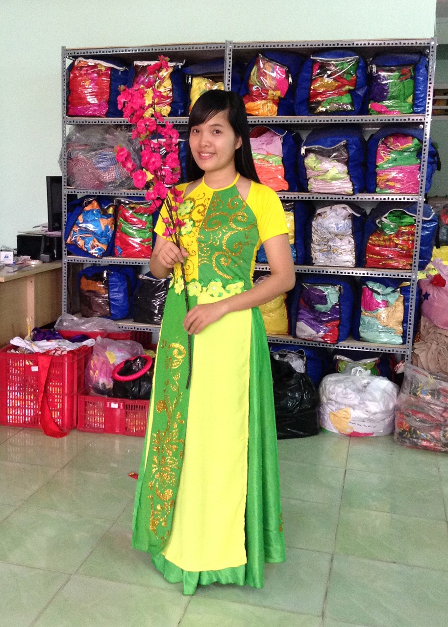 Đầm múa 4 tà, hoa dán màu vàng – xanh