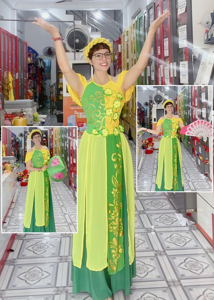 Đầm múa hát: áo dài yếm nhiều tà hoa dán vàng xanh lá