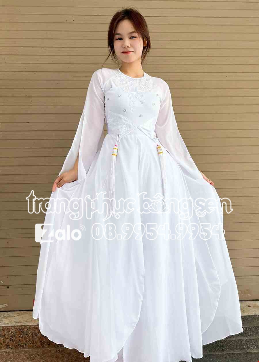 Đầm múa hát trắng tinh khôi cổ tròn tay xẻ