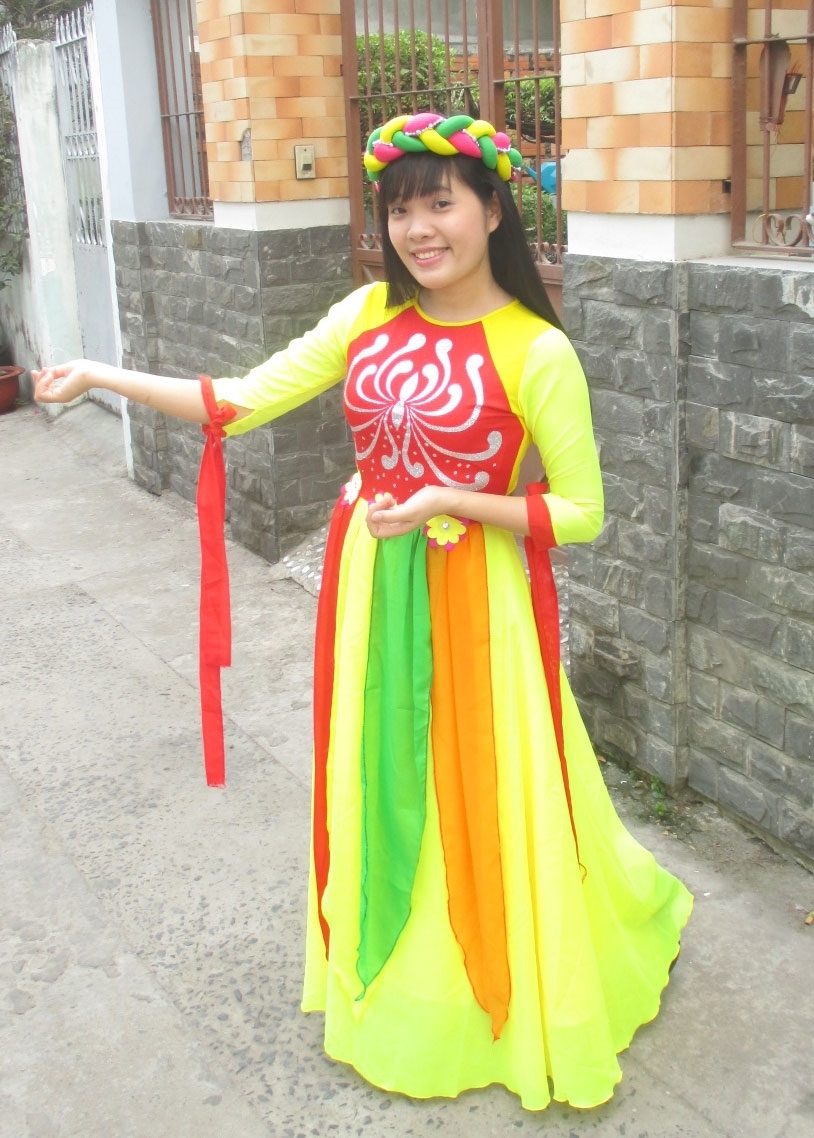 Đầm múa thân đỏ váy vàng 3 tà nhỏ