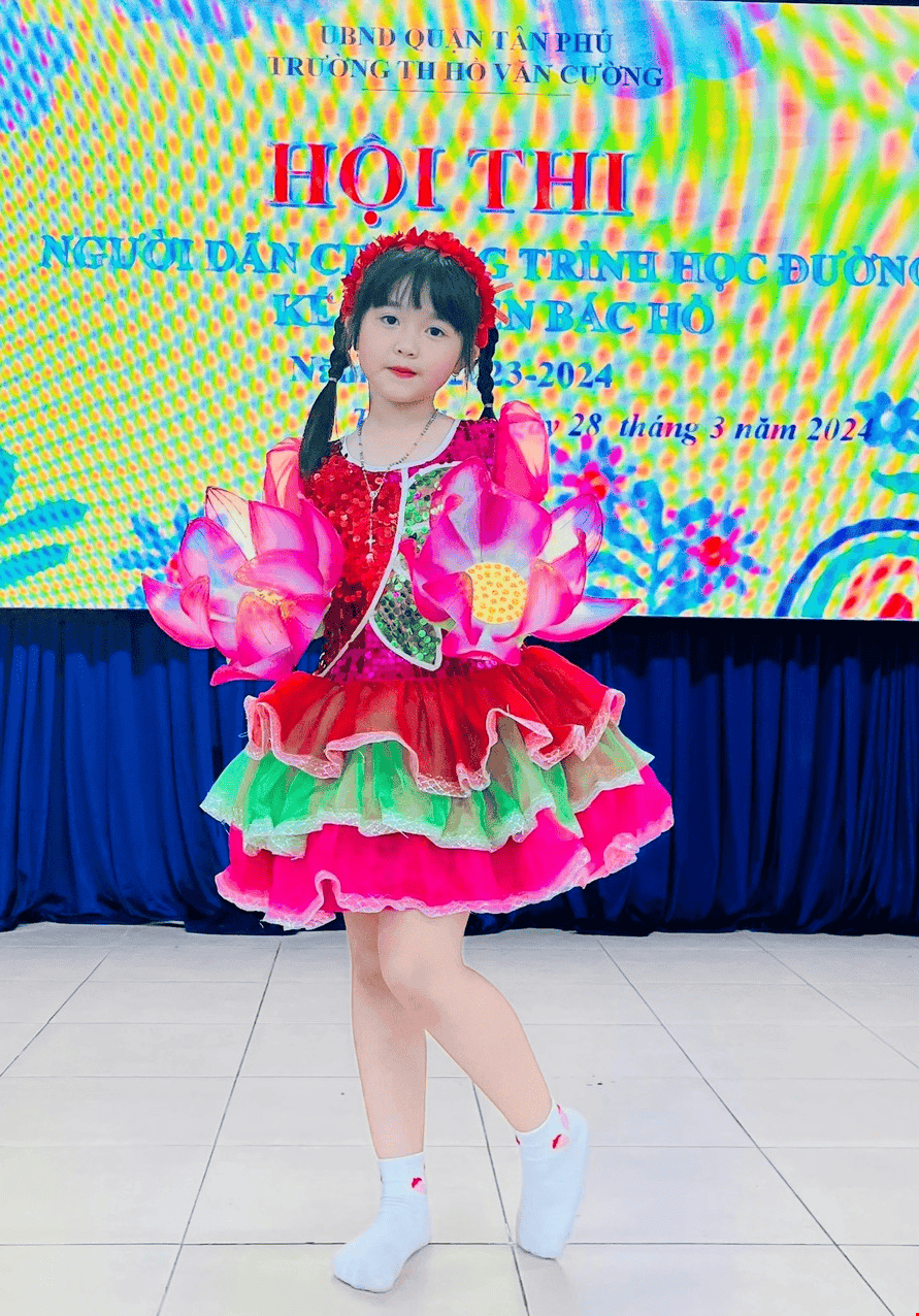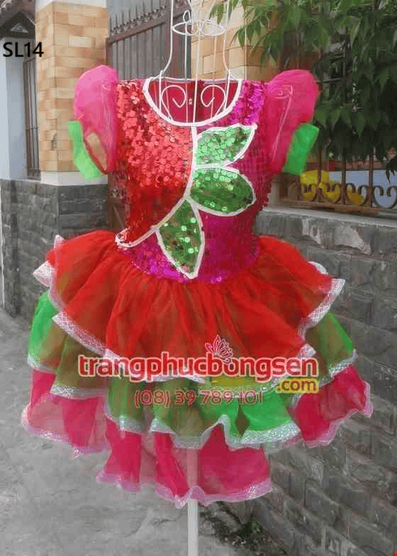 Đầm múa trẻ em kim sa 3 tầng voan đỏ xanh hồng