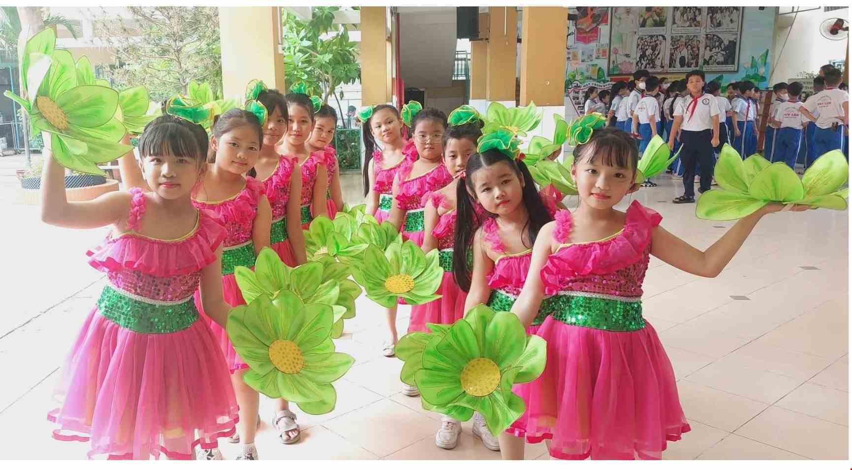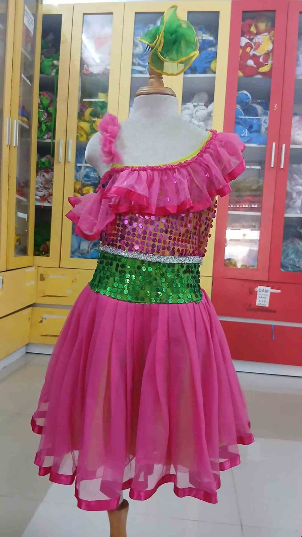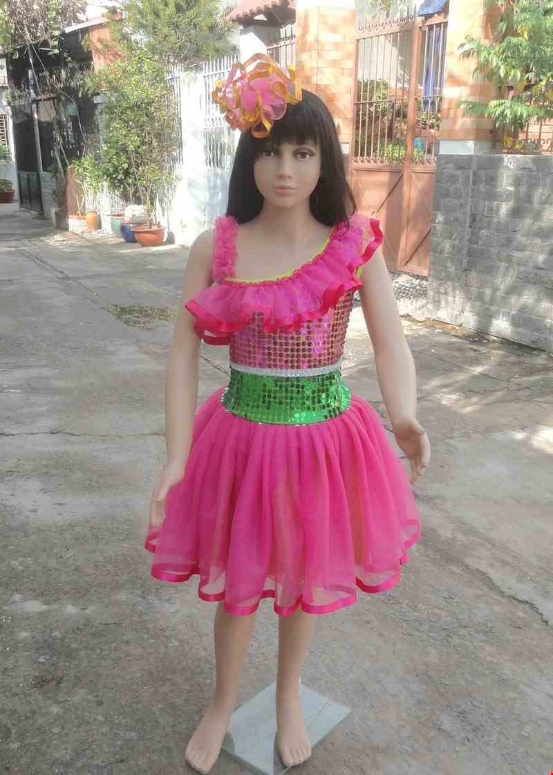 Đầm múa trẻ em kim sa hồng – xanh lá bèo chéo vai