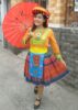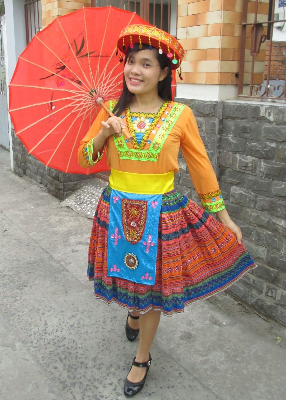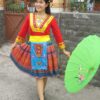 Dân tộc Mèo áo thun cam viền xanh lá đai, váy thổ cẩm