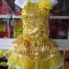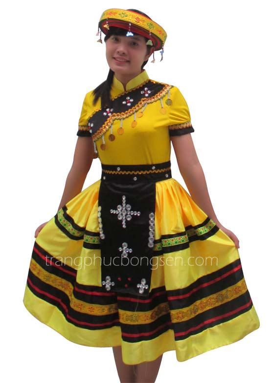 Đồ dân tộc Mèo áo thun viền sóng cổ trụ, váy phi bóng kết thổ cẩm màu vàng