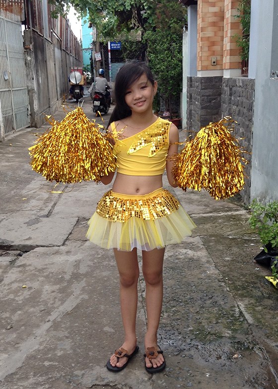 Đồ múa cổ động áo chéo vai, váy vàng mầm non