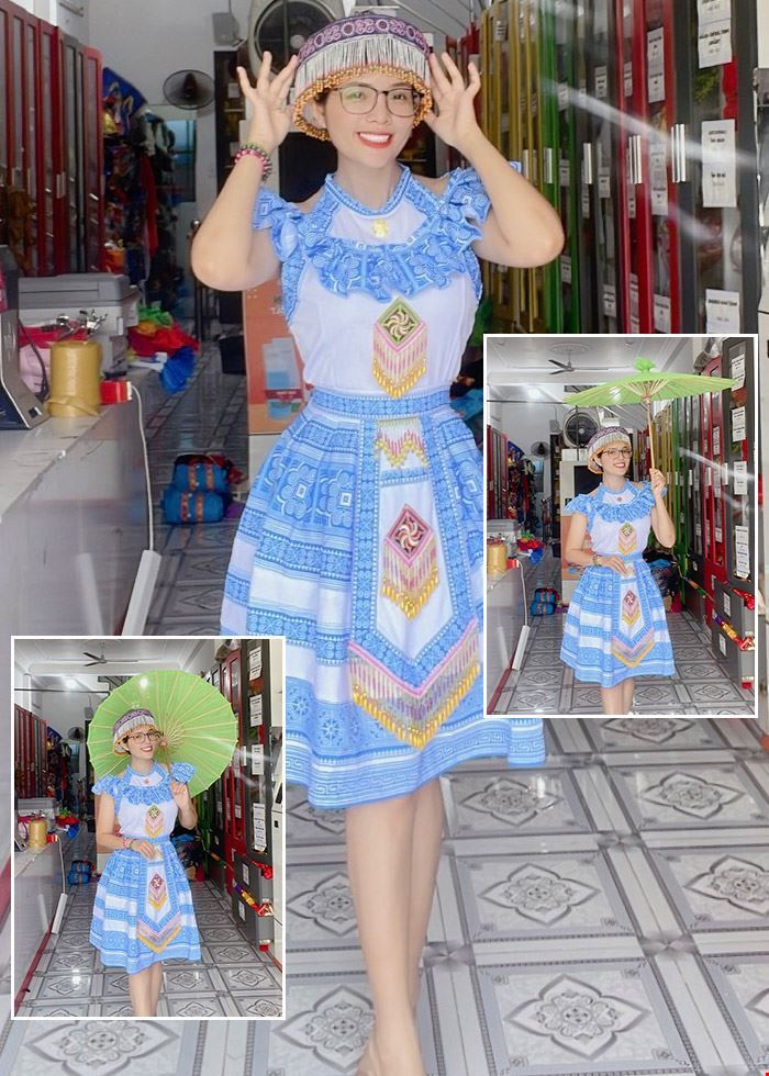 Trang phục biểu diễn 54 dân tộc (lẻ): Mèo/ H’ Mông cổ yếm, trắng phối xanh e