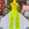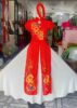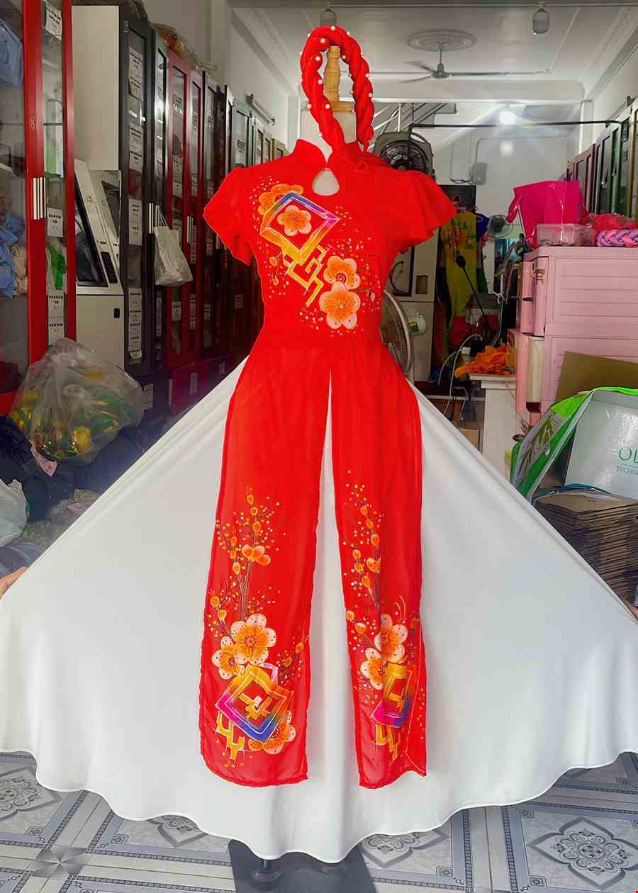 Trang phục hát múa áo dài cách điệu đỏ 3 tà hoa đào, tay cánh tiên