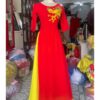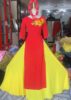Trang phục hát múa áo dài lụa đỏ cổ tròn dán đá, hoa 3D