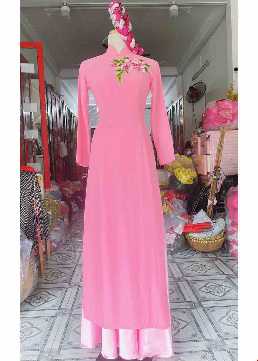 Trang phục hát múa áo dài lụa hồng phấn ngực kết hoa 3D