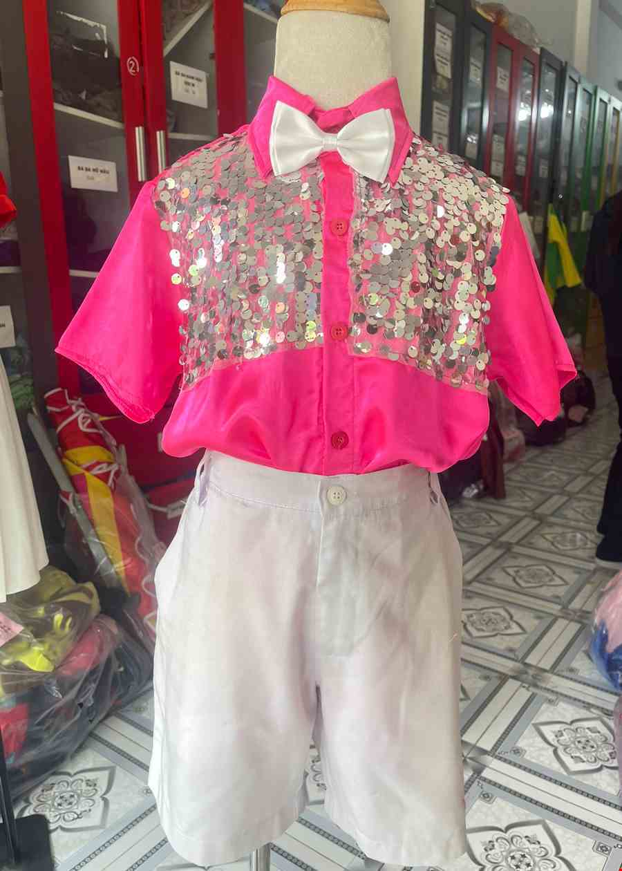 Trang phục hát múa trẻ em nam sơ mi kim sa hồng quần short
