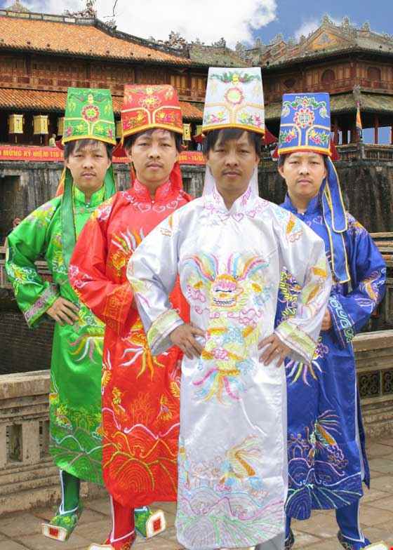 Các mấu trang phục diễn kịch Táo Quân vào dịp Tết. Các mẫu trang phục này cũng có thể được mặc để dóng vai vua quan trong các vở kịch.