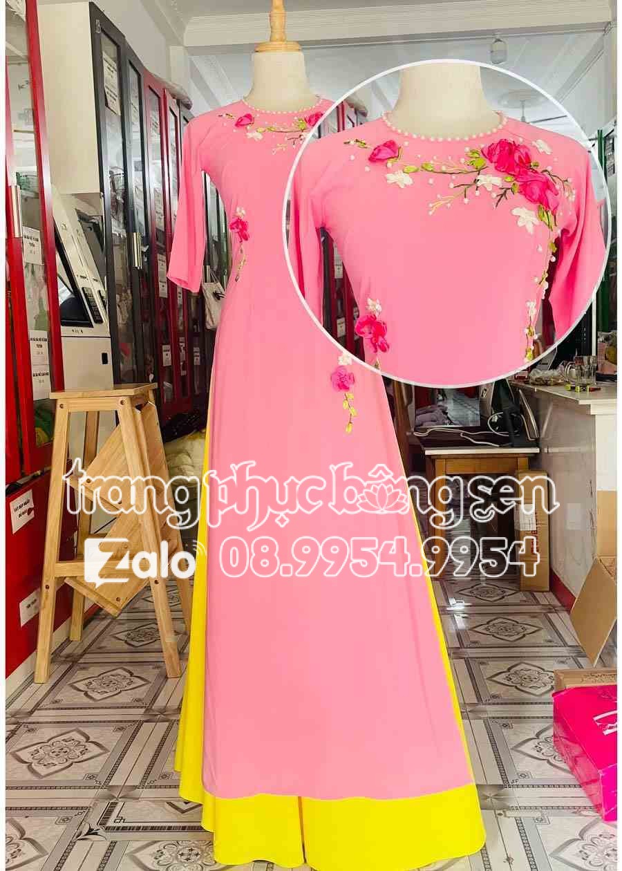 Trang phục truyền thống áo dài lụa hồng thêu hoa ruy băng