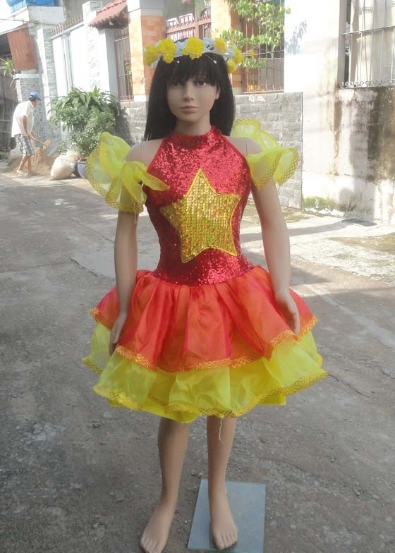 Váy múa trẻ em kim sa đỏ vàng ngực sao vàng